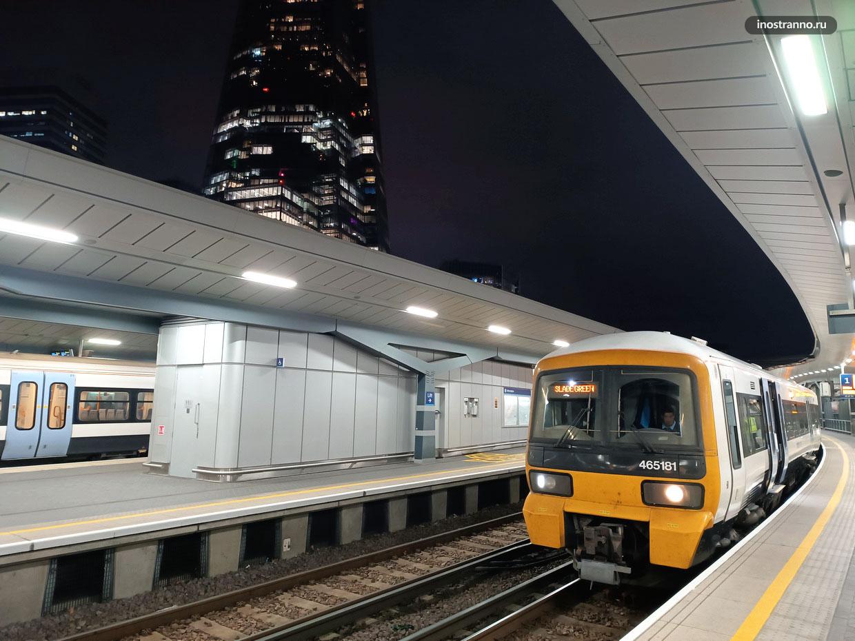Если идти с рынка к станции метро London Bridge, можно сделать интересные кадры с небоскребом Шард. На мой снимок Шард попал вместе с желтым поездом пригородной электрички.