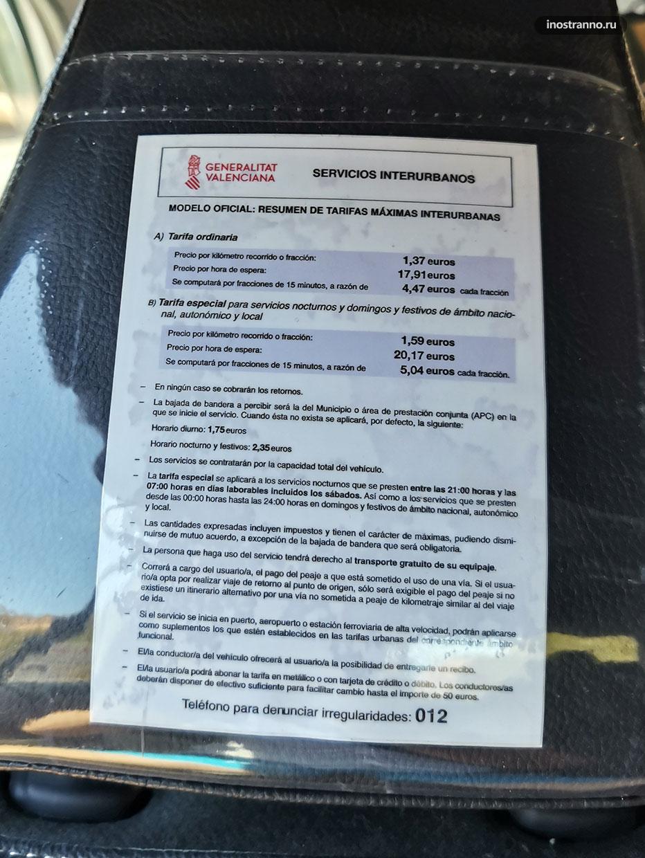 Ниже вы видите фото официальных тарифов на проезд в такси в Торревьехе. Из фотографии видно, что стоимость проезда зависит от дня недели и варьируется от 1,37 до 1,59 евро.